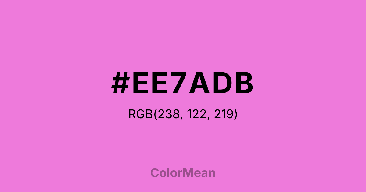 #EE7ADB RGB value is (238, 122, 219). The hex color red value is 238, green is 122, and blue is 219. Its HSL format shows a hue of 310°, saturation of 77 percent, and lightness of 71 percent. The CMYK process values are 0 percent, 49 percent, 8 percent, 7 percent.
