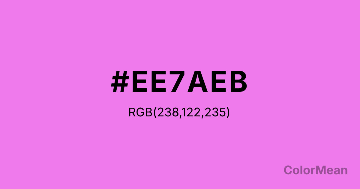 #EE7AEB RGB value is (238, 122, 235). The hex color red value is 238, green is 122, and blue is 235. Its HSL format shows a hue of 302°, saturation of 77 percent, and lightness of 71 percent. The CMYK process values are 0 percent, 49 percent, 1 percent, 7 percent.