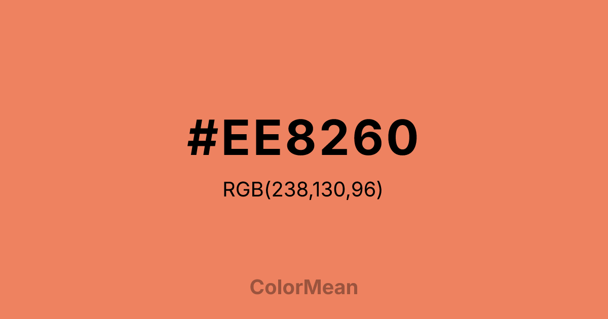 #EE8260 RGB value is (238, 130, 96). The hex color red value is 238, green is 130, and blue is 96. Its HSL format shows a hue of 14°, saturation of 81 percent, and lightness of 65 percent. The CMYK process values are 0 percent, 45 percent, 60 percent, 7 percent.