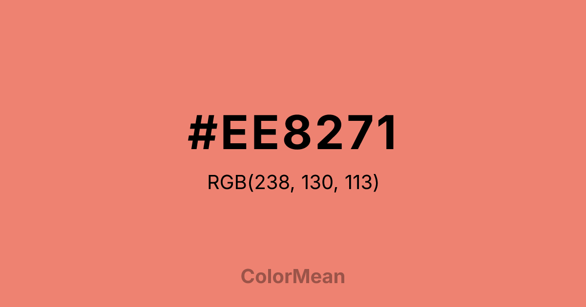 #EE8271 RGB value is (238, 130, 113). The hex color red value is 238, green is 130, and blue is 113. Its HSL format shows a hue of 8°, saturation of 79 percent, and lightness of 69 percent. The CMYK process values are 0 percent, 45 percent, 53 percent, 7 percent.