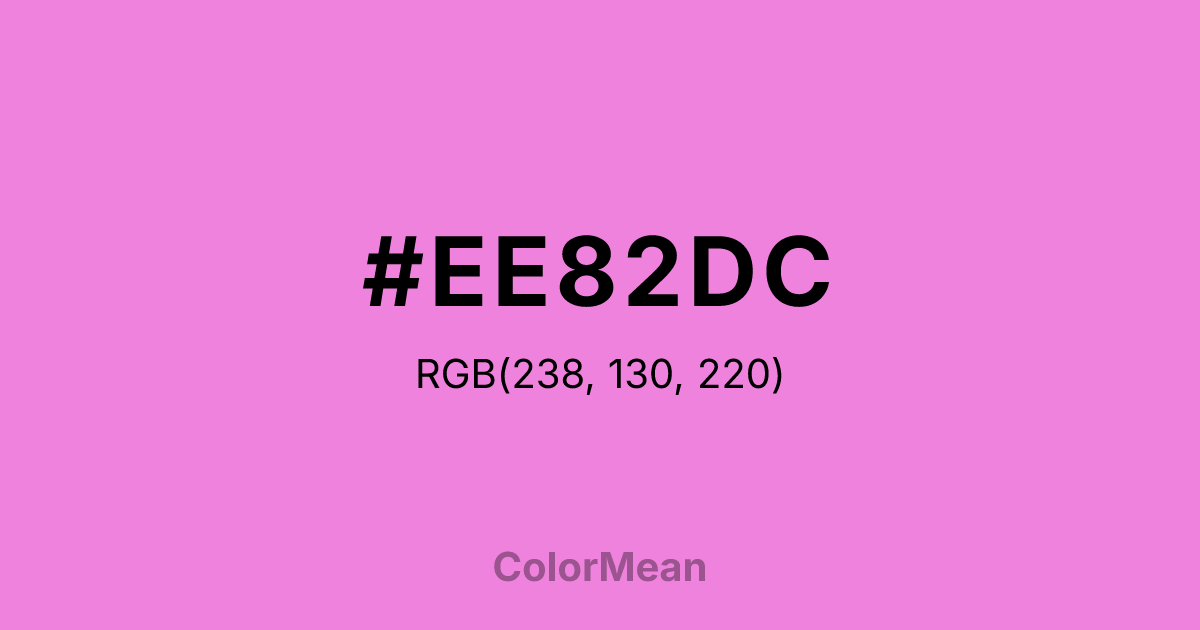 #EE82DC RGB value is (238, 130, 220). The hex color red value is 238, green is 130, and blue is 220. Its HSL format shows a hue of 310°, saturation of 76 percent, and lightness of 72 percent. The CMYK process values are 0 percent, 45 percent, 8 percent, 7 percent.