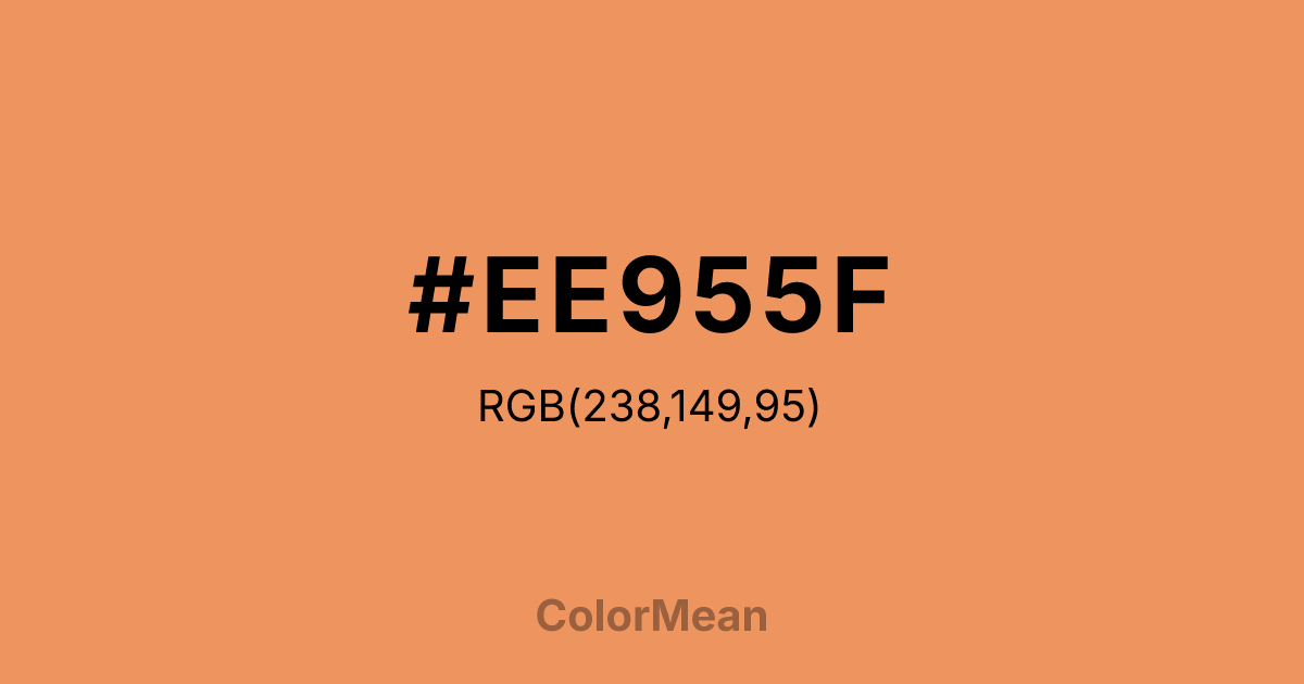 #EE955F RGB value is (238, 149, 95). The hex color red value is 238, green is 149, and blue is 95. Its HSL format shows a hue of 23°, saturation of 81 percent, and lightness of 65 percent. The CMYK process values are 0 percent, 37 percent, 60 percent, 7 percent.