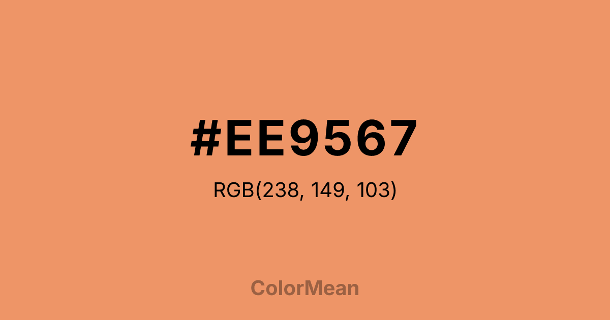 #EE9567 RGB value is (238, 149, 103). The hex color red value is 238, green is 149, and blue is 103. Its HSL format shows a hue of 20°, saturation of 80 percent, and lightness of 67 percent. The CMYK process values are 0 percent, 37 percent, 57 percent, 7 percent.