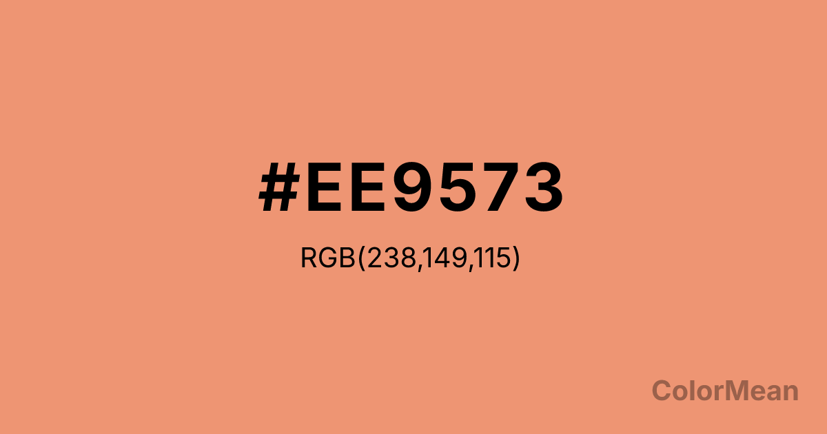 #EE9573 RGB value is (238, 149, 115). The hex color red value is 238, green is 149, and blue is 115. Its HSL format shows a hue of 17°, saturation of 78 percent, and lightness of 69 percent. The CMYK process values are 0 percent, 37 percent, 52 percent, 7 percent.