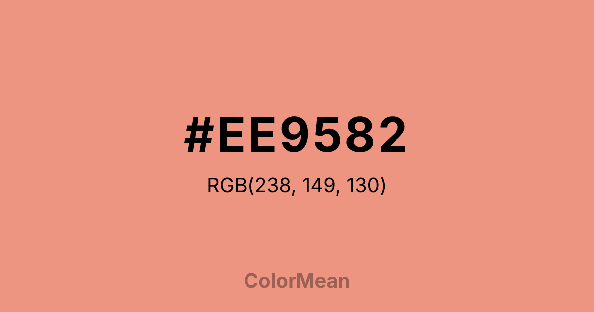 #EE9582 RGB value is (238, 149, 130). The hex color red value is 238, green is 149, and blue is 130. Its HSL format shows a hue of 11°, saturation of 76 percent, and lightness of 72 percent. The CMYK process values are 0 percent, 37 percent, 45 percent, 7 percent.