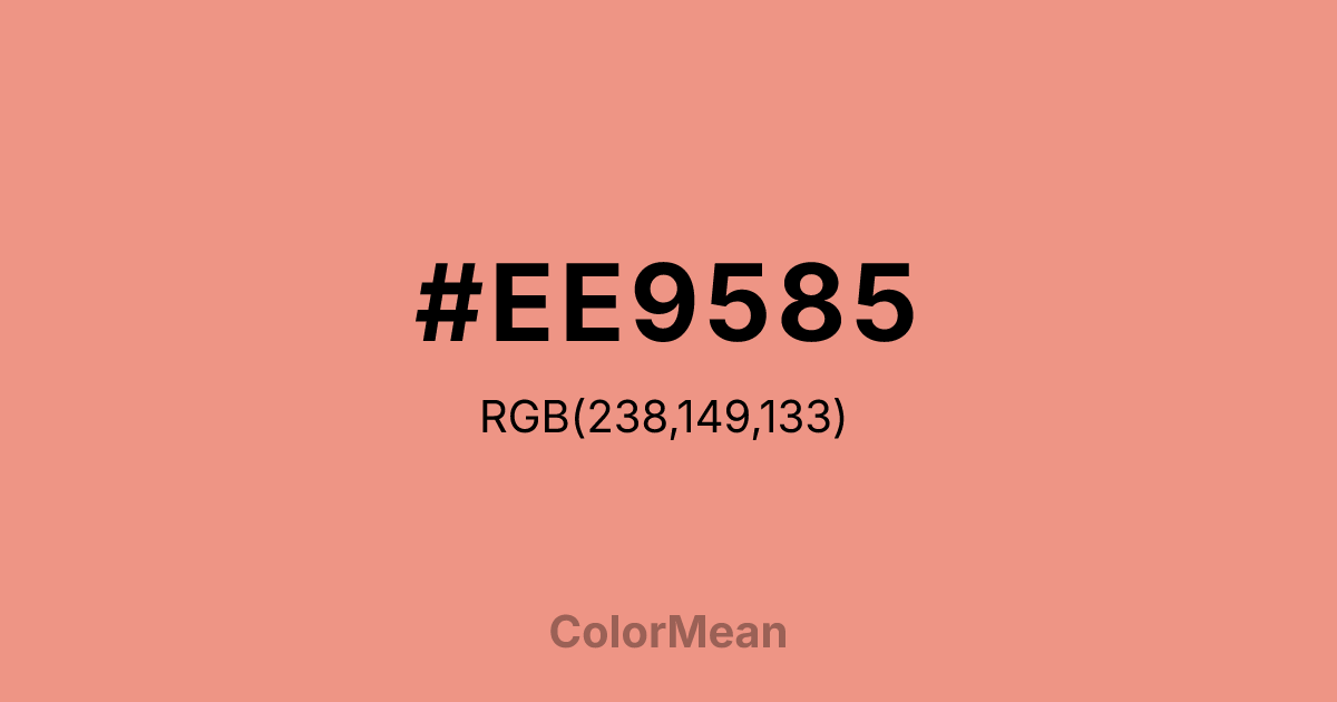 #EE9585 RGB value is (238, 149, 133). The hex color red value is 238, green is 149, and blue is 133. Its HSL format shows a hue of 9°, saturation of 76 percent, and lightness of 73 percent. The CMYK process values are 0 percent, 37 percent, 44 percent, 7 percent.