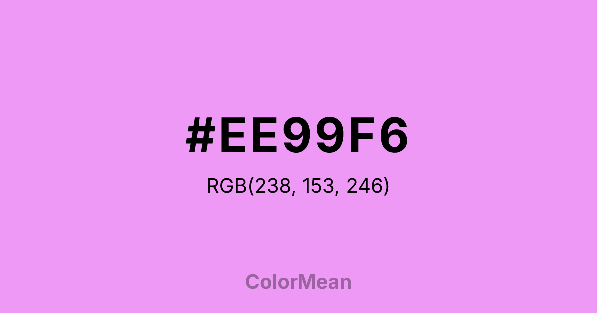 #EE99F6 RGB value is (238, 153, 246). The hex color red value is 238, green is 153, and blue is 246. Its HSL format shows a hue of 295°, saturation of 84 percent, and lightness of 78 percent. The CMYK process values are 3 percent, 38 percent, 0 percent, 4 percent.