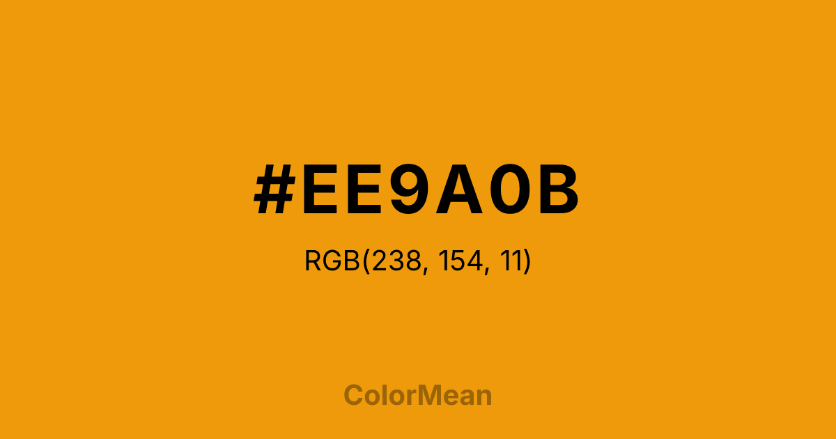 #EE9A0B RGB value is (238, 154, 11). The hex color red value is 238, green is 154, and blue is 11. Its HSL format shows a hue of 38°, saturation of 91 percent, and lightness of 49 percent. The CMYK process values are 0 percent, 35 percent, 95 percent, 7 percent.