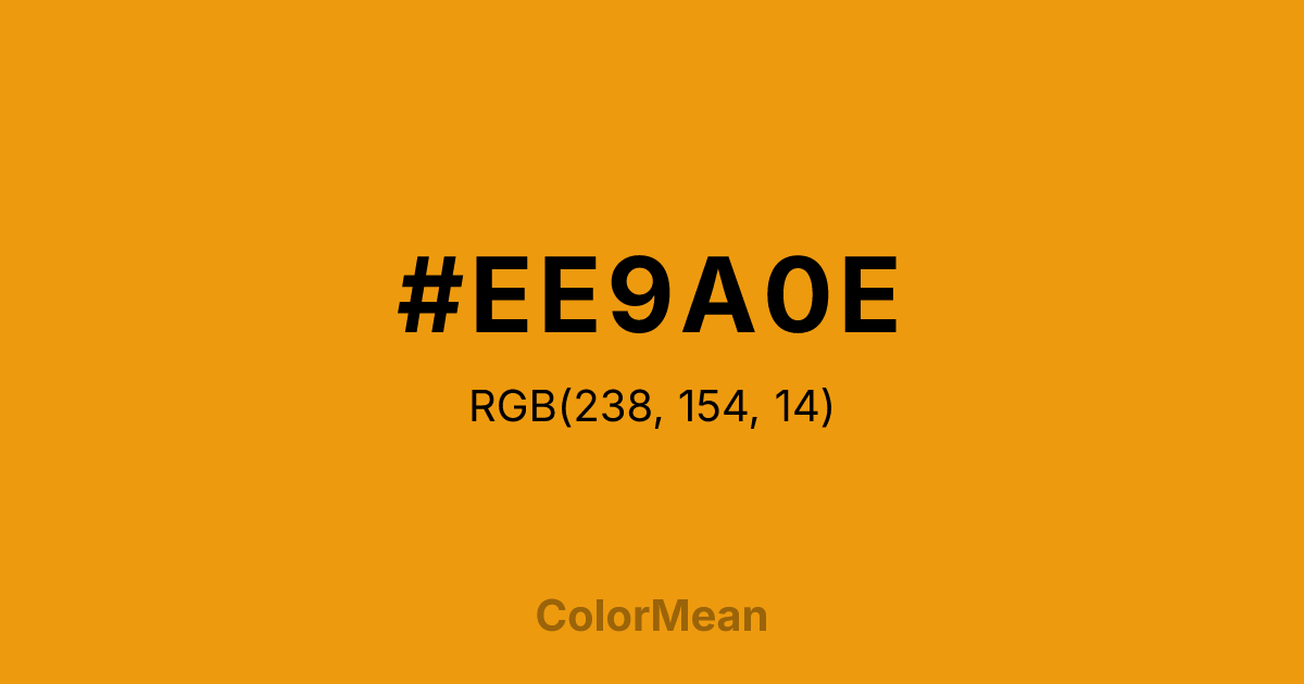 #EE9A0E RGB value is (238, 154, 14). The hex color red value is 238, green is 154, and blue is 14. Its HSL format shows a hue of 37°, saturation of 89 percent, and lightness of 49 percent. The CMYK process values are 0 percent, 35 percent, 94 percent, 7 percent.