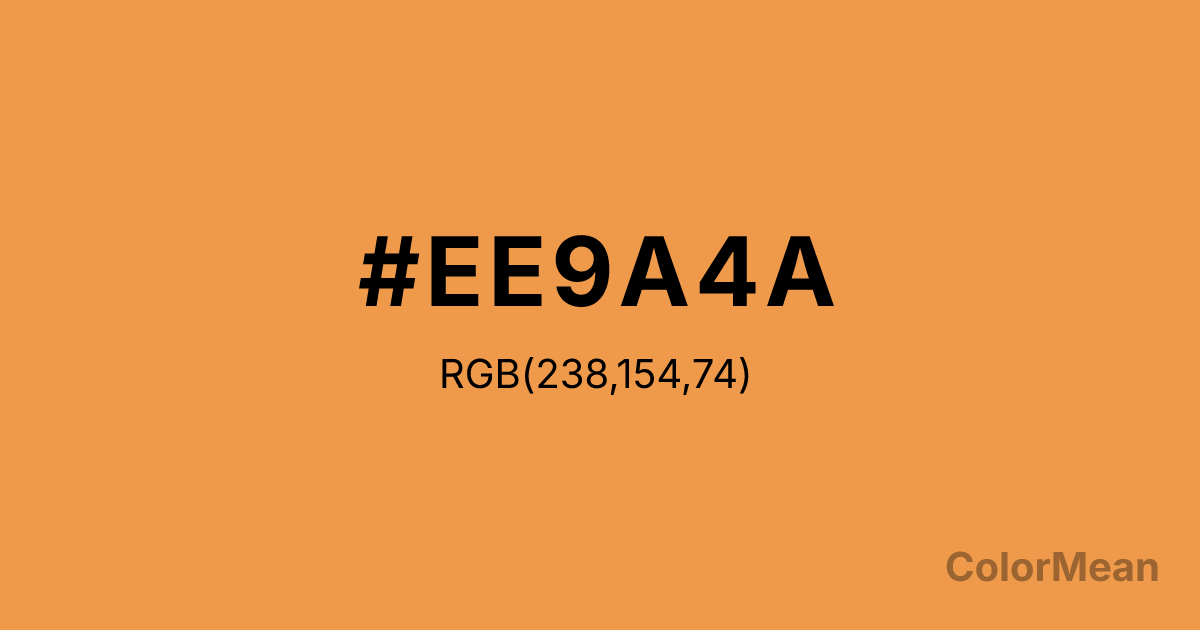 #EE9A4A RGB value is (238, 154, 74). The hex color red value is 238, green is 154, and blue is 74. Its HSL format shows a hue of 29°, saturation of 83 percent, and lightness of 61 percent. The CMYK process values are 0 percent, 35 percent, 69 percent, 7 percent.