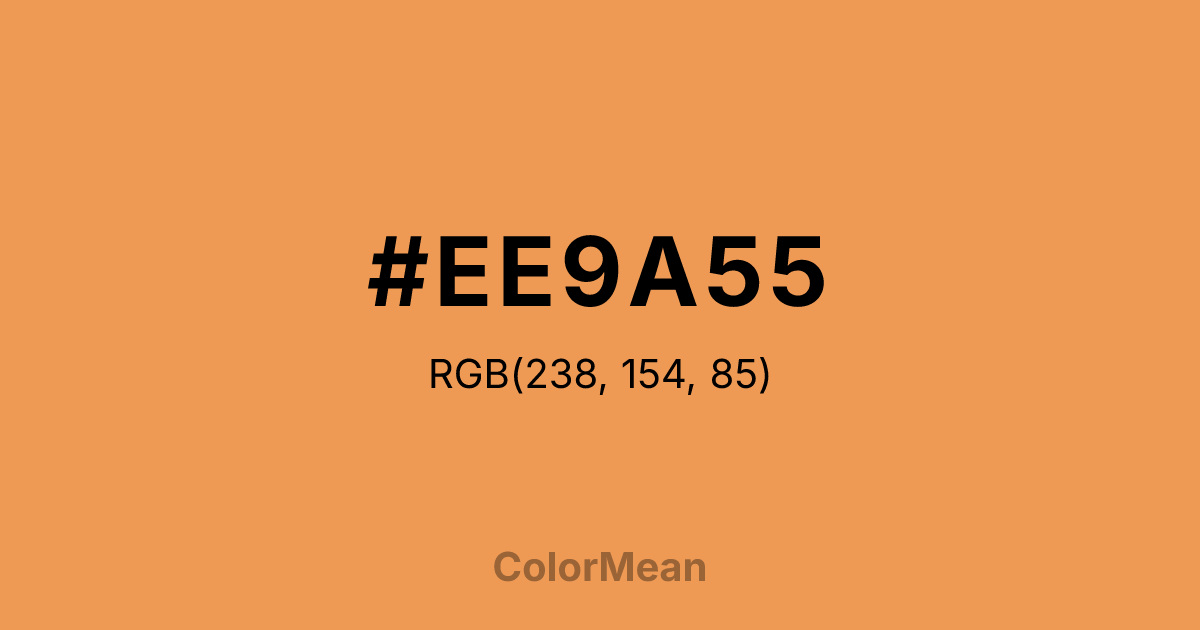 #EE9A55 RGB value is (238, 154, 85). The hex color red value is 238, green is 154, and blue is 85. Its HSL format shows a hue of 27°, saturation of 82 percent, and lightness of 63 percent. The CMYK process values are 0 percent, 35 percent, 64 percent, 7 percent.