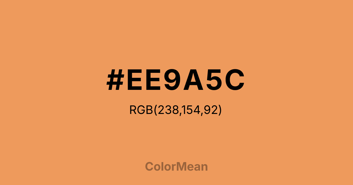 #EE9A5C RGB value is (238, 154, 92). The hex color red value is 238, green is 154, and blue is 92. Its HSL format shows a hue of 25°, saturation of 81 percent, and lightness of 65 percent. The CMYK process values are 0 percent, 35 percent, 61 percent, 7 percent.