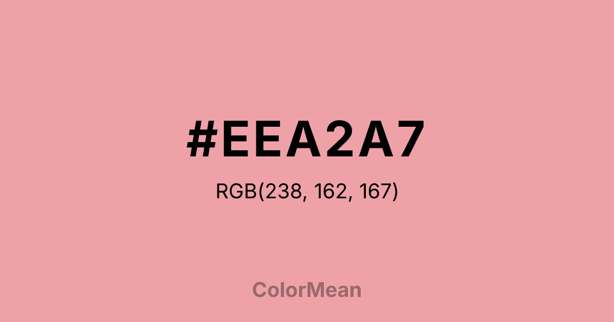 #EEA2A7 RGB value is (238, 162, 167). The hex color red value is 238, green is 162, and blue is 167. Its HSL format shows a hue of 356°, saturation of 69 percent, and lightness of 78 percent. The CMYK process values are 0 percent, 32 percent, 30 percent, 7 percent.