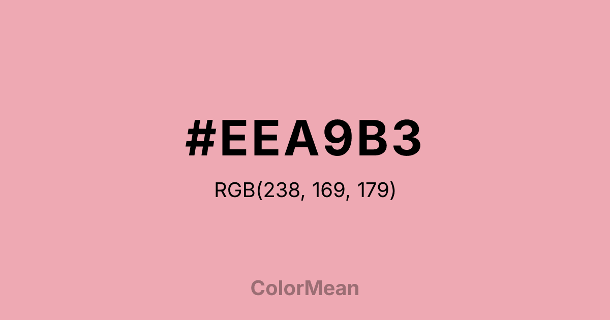 #EEA9B3 RGB value is (238, 169, 179). The hex color red value is 238, green is 169, and blue is 179. Its HSL format shows a hue of 351°, saturation of 67 percent, and lightness of 80 percent. The CMYK process values are 0 percent, 29 percent, 25 percent, 7 percent.