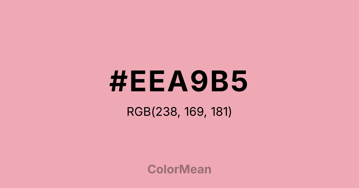 #EEA9B5 RGB value is (238, 169, 181). The hex color red value is 238, green is 169, and blue is 181. Its HSL format shows a hue of 350°, saturation of 67 percent, and lightness of 80 percent. The CMYK process values are 0 percent, 29 percent, 24 percent, 7 percent.