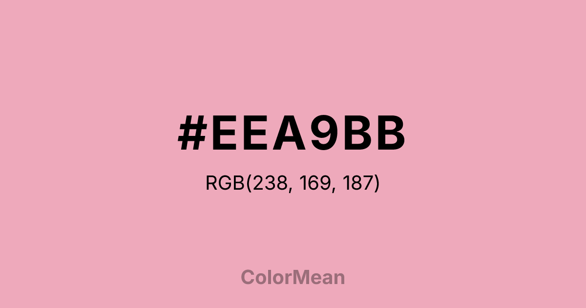 #EEA9BB RGB value is (238, 169, 187). The hex color red value is 238, green is 169, and blue is 187. Its HSL format shows a hue of 344°, saturation of 67 percent, and lightness of 80 percent. The CMYK process values are 0 percent, 29 percent, 21 percent, 7 percent.