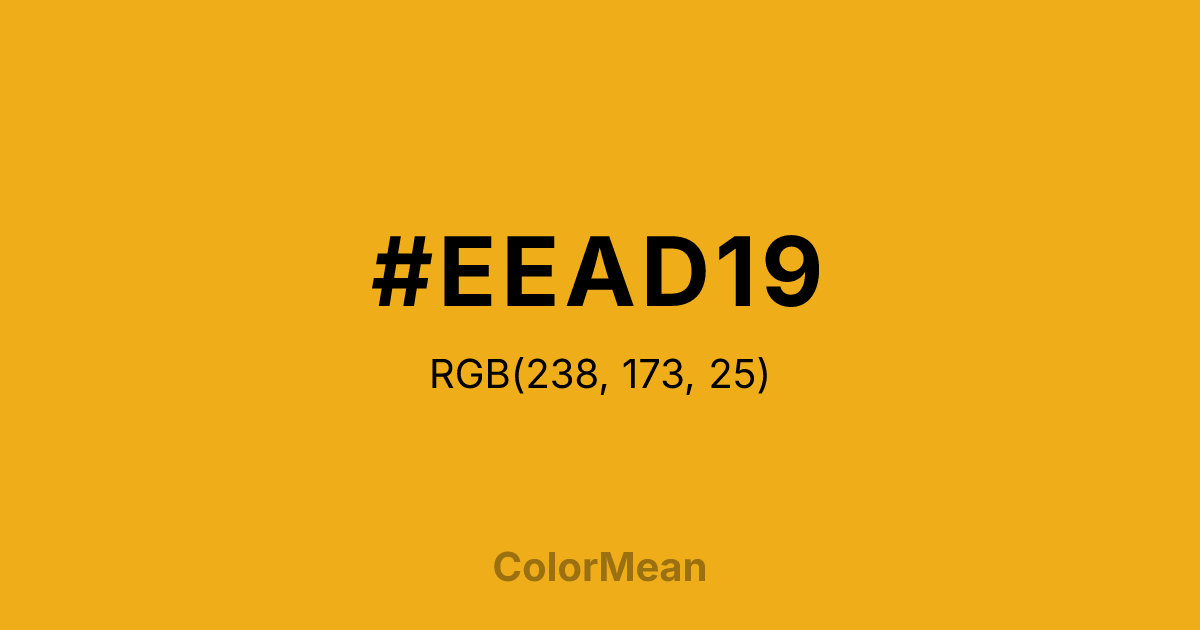 #EEAD19 RGB value is (238, 173, 25). The hex color red value is 238, green is 173, and blue is 25. Its HSL format shows a hue of 42°, saturation of 86 percent, and lightness of 52 percent. The CMYK process values are 0 percent, 27 percent, 89 percent, 7 percent.