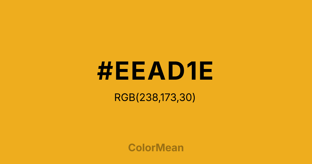 #EEAD1E RGB value is (238, 173, 30). The hex color red value is 238, green is 173, and blue is 30. Its HSL format shows a hue of 41°, saturation of 86 percent, and lightness of 53 percent. The CMYK process values are 0 percent, 27 percent, 87 percent, 7 percent.