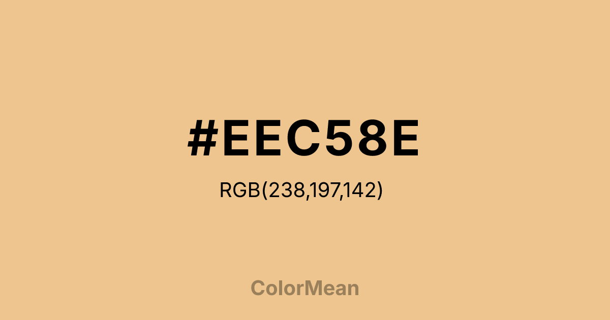 #EEC58E RGB value is (238, 197, 142). The hex color red value is 238, green is 197, and blue is 142. Its HSL format shows a hue of 34°, saturation of 74 percent, and lightness of 75 percent. The CMYK process values are 0 percent, 17 percent, 40 percent, 7 percent.
