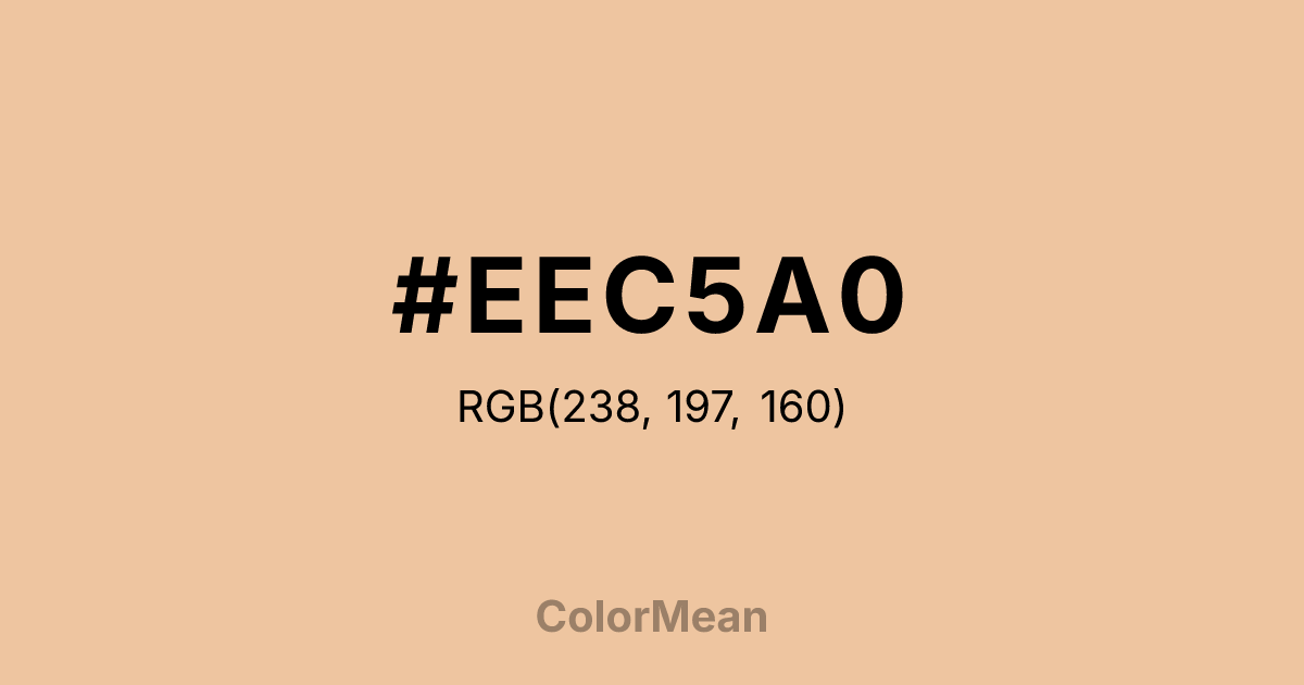 #EEC5A0 RGB value is (238, 197, 160). The hex color red value is 238, green is 197, and blue is 160. Its HSL format shows a hue of 28°, saturation of 70 percent, and lightness of 78 percent. The CMYK process values are 0 percent, 17 percent, 33 percent, 7 percent.