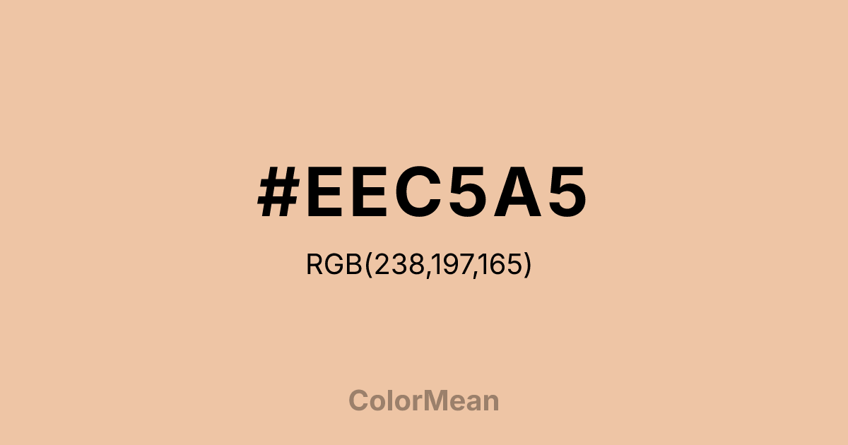 #EEC5A5 RGB value is (238, 197, 165). The hex color red value is 238, green is 197, and blue is 165. Its HSL format shows a hue of 26°, saturation of 68 percent, and lightness of 79 percent. The CMYK process values are 0 percent, 17 percent, 31 percent, 7 percent.