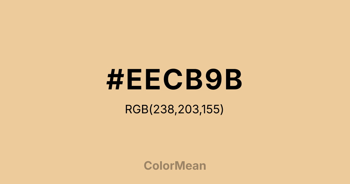 #EECB9B RGB value is (238, 203, 155). The hex color red value is 238, green is 203, and blue is 155. Its HSL format shows a hue of 35°, saturation of 71 percent, and lightness of 77 percent. The CMYK process values are 0 percent, 15 percent, 35 percent, 7 percent.