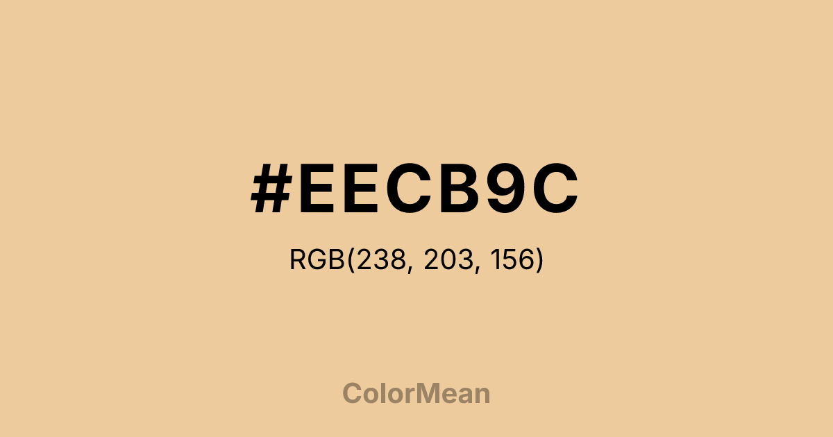 #EECB9C RGB value is (238, 203, 156). The hex color red value is 238, green is 203, and blue is 156. Its HSL format shows a hue of 34°, saturation of 71 percent, and lightness of 77 percent. The CMYK process values are 0 percent, 15 percent, 34 percent, 7 percent.