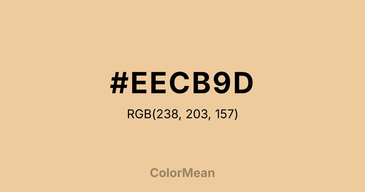 #EECB9D RGB value is (238, 203, 157). The hex color red value is 238, green is 203, and blue is 157. Its HSL format shows a hue of 34°, saturation of 70 percent, and lightness of 77 percent. The CMYK process values are 0 percent, 15 percent, 34 percent, 7 percent.