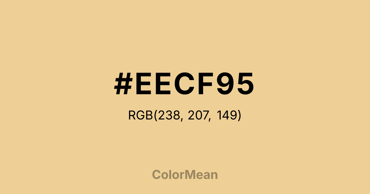 #EECF95 RGB value is (238, 207, 149). The hex color red value is 238, green is 207, and blue is 149. Its HSL format shows a hue of 39°, saturation of 72 percent, and lightness of 76 percent. The CMYK process values are 0 percent, 13 percent, 37 percent, 7 percent.