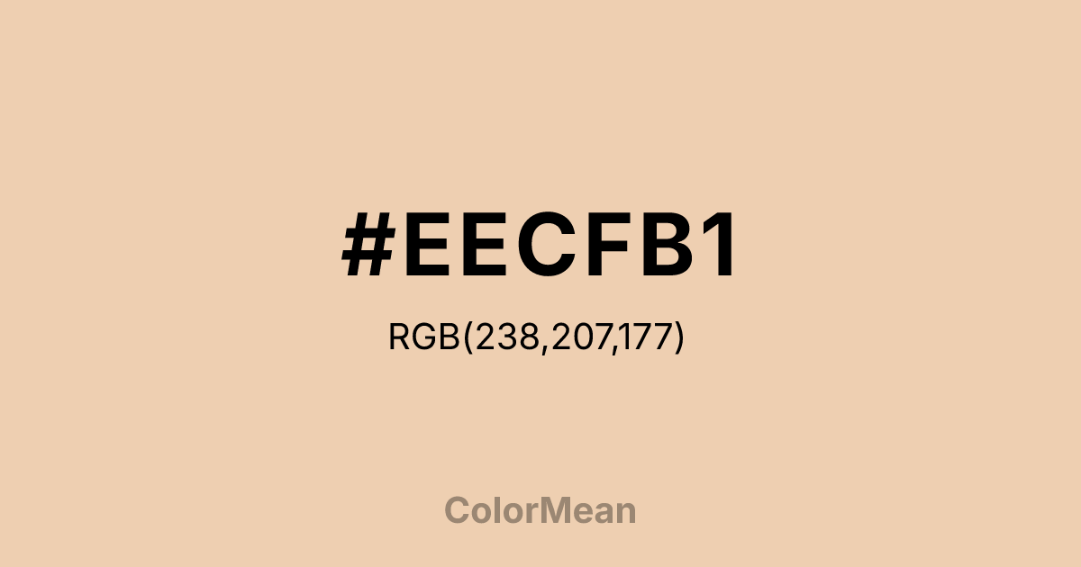 #EECFB1 RGB value is (238, 207, 177). The hex color red value is 238, green is 207, and blue is 177. Its HSL format shows a hue of 30°, saturation of 64 percent, and lightness of 81 percent. The CMYK process values are 0 percent, 13 percent, 26 percent, 7 percent.
