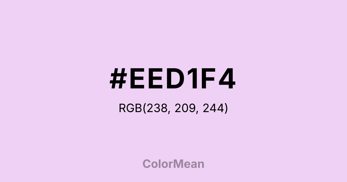 #EED1F4 RGB value is (238, 209, 244). The hex color red value is 238, green is 209, and blue is 244. Its HSL format shows a hue of 290°, saturation of 61 percent, and lightness of 89 percent. The CMYK process values are 2 percent, 14 percent, 0 percent, 4 percent.
