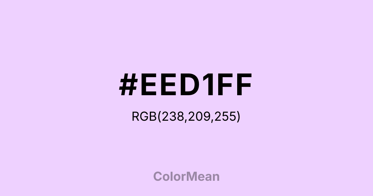 #EED1FF RGB value is (238, 209, 255). The hex color red value is 238, green is 209, and blue is 255. Its HSL format shows a hue of 278°, saturation of 100 percent, and lightness of 91 percent. The CMYK process values are 7 percent, 18 percent, 0 percent, 0 percent.
