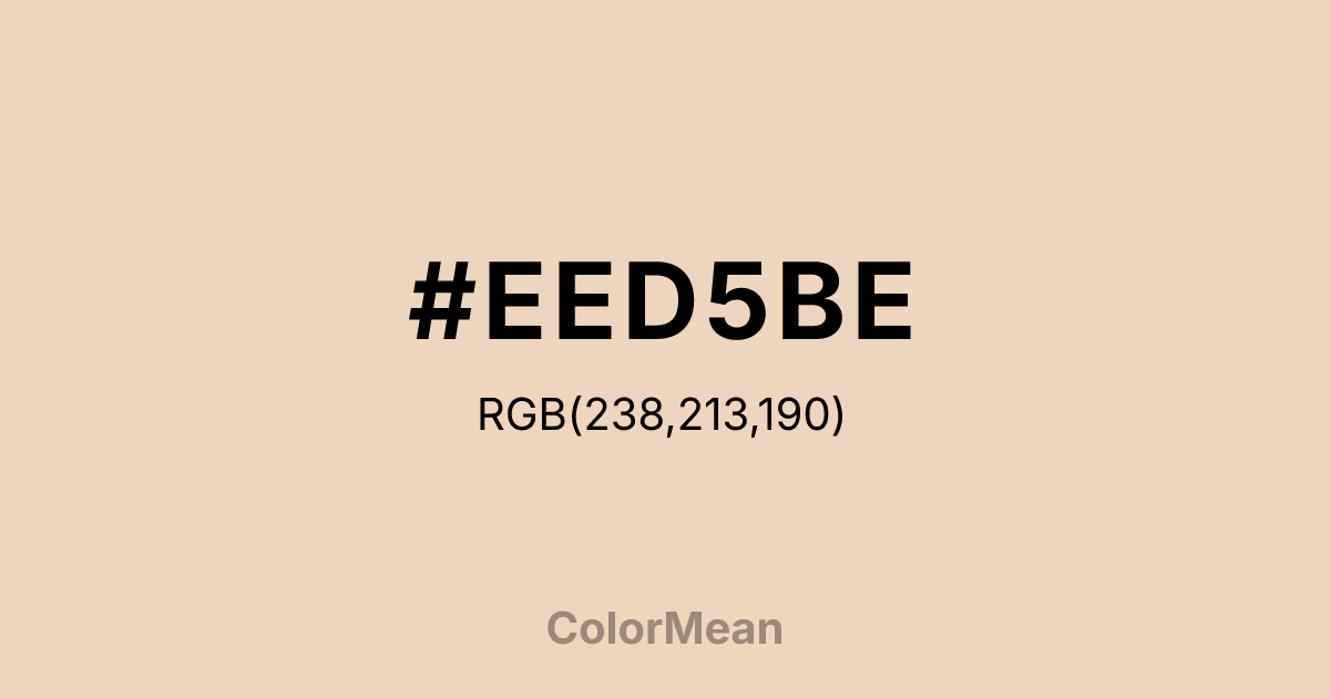 #EED5BE RGB value is (238, 213, 190). The hex color red value is 238, green is 213, and blue is 190. Its HSL format shows a hue of 29°, saturation of 59 percent, and lightness of 84 percent. The CMYK process values are 0 percent, 11 percent, 20 percent, 7 percent.