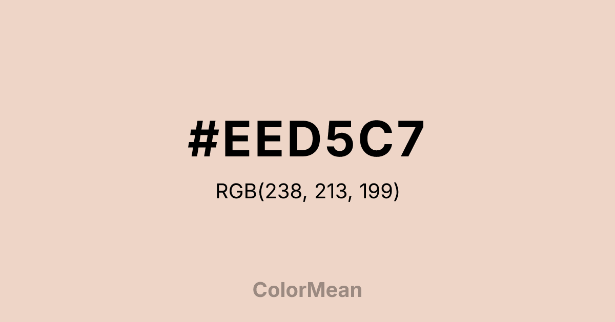 #EED5C7 RGB value is (238, 213, 199). The hex color red value is 238, green is 213, and blue is 199. Its HSL format shows a hue of 22°, saturation of 53 percent, and lightness of 86 percent. The CMYK process values are 0 percent, 11 percent, 16 percent, 7 percent.