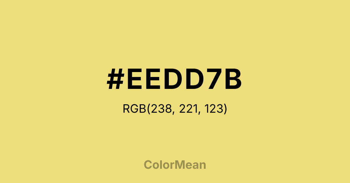 #EEDD7B RGB value is (238, 221, 123). The hex color red value is 238, green is 221, and blue is 123. Its HSL format shows a hue of 51°, saturation of 77 percent, and lightness of 71 percent. The CMYK process values are 0 percent, 7 percent, 48 percent, 7 percent.