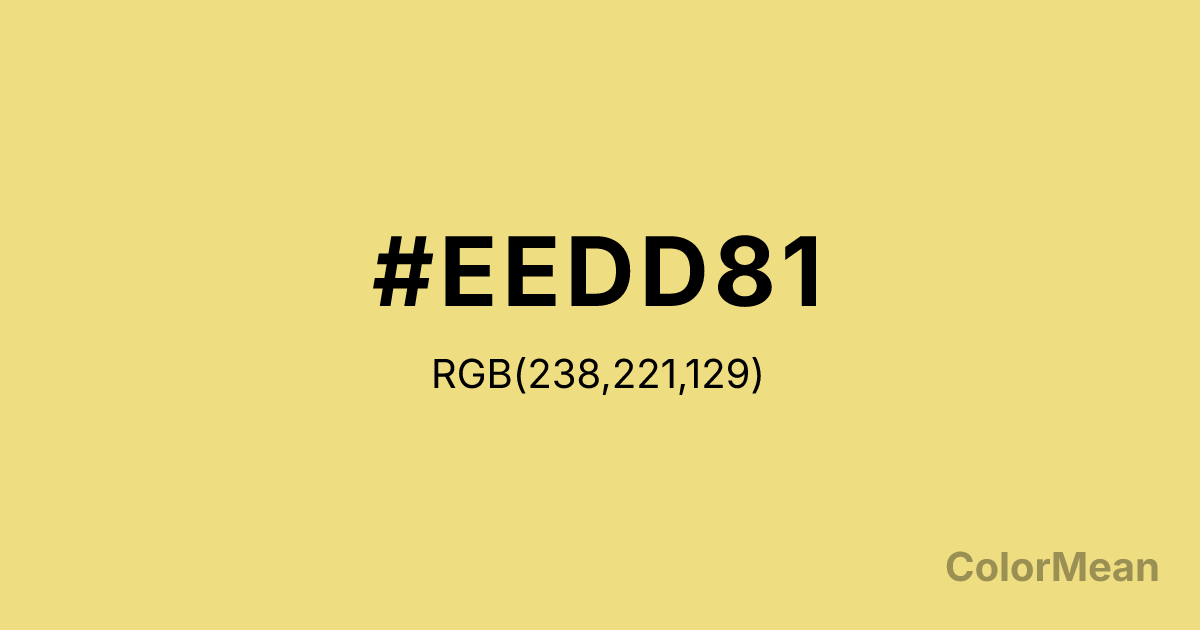 #EEDD81 RGB value is (238, 221, 129). The hex color red value is 238, green is 221, and blue is 129. Its HSL format shows a hue of 51°, saturation of 76 percent, and lightness of 72 percent. The CMYK process values are 0 percent, 7 percent, 46 percent, 7 percent.