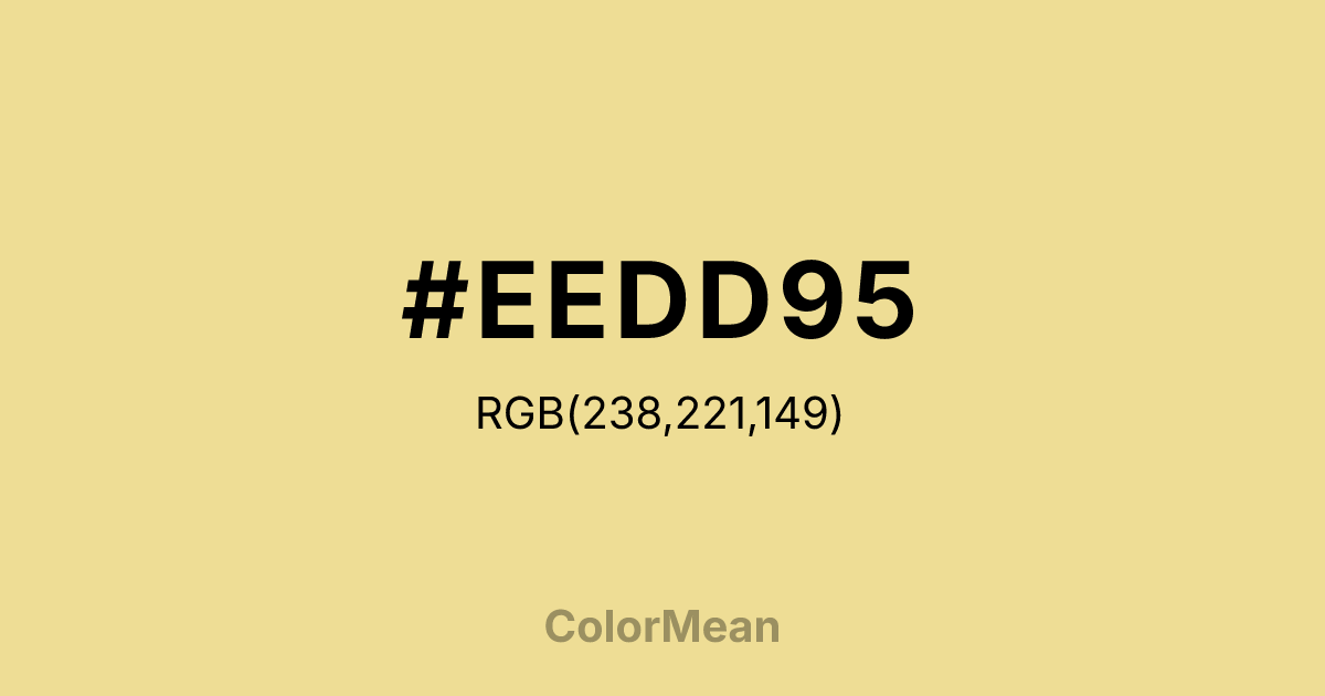 #EEDD95 RGB value is (238, 221, 149). The hex color red value is 238, green is 221, and blue is 149. Its HSL format shows a hue of 49°, saturation of 72 percent, and lightness of 76 percent. The CMYK process values are 0 percent, 7 percent, 37 percent, 7 percent.