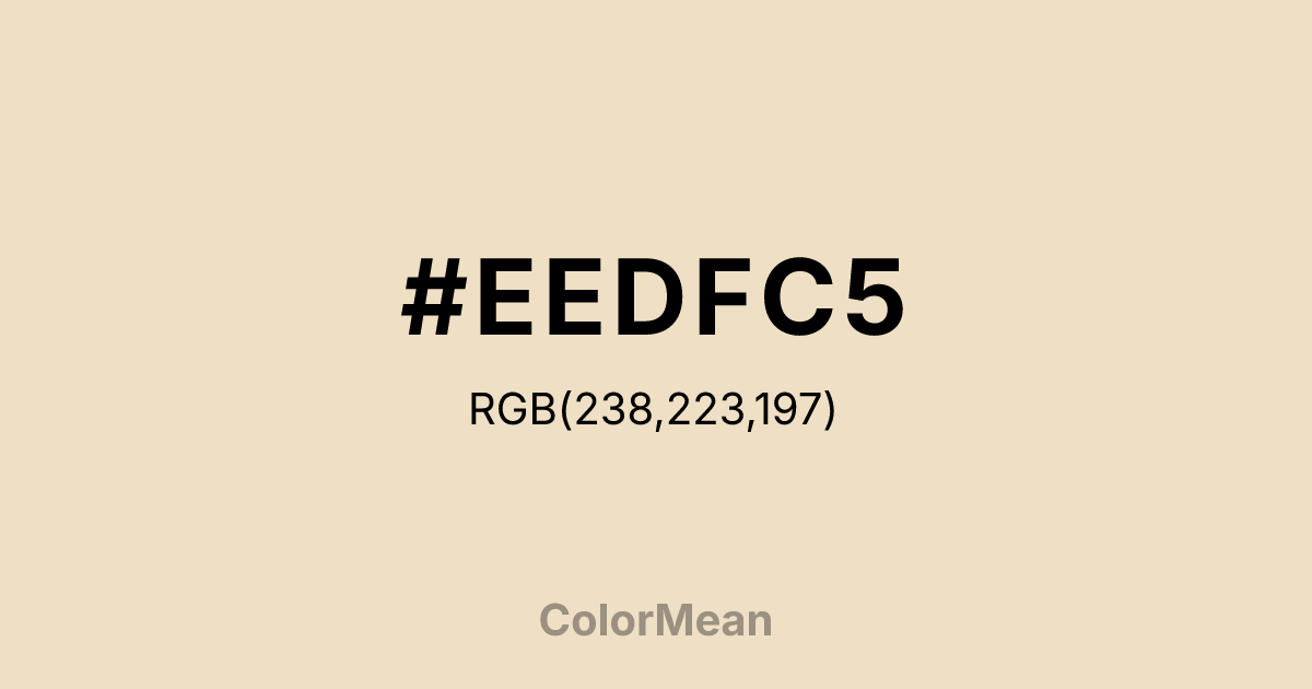 #EEDFC5 RGB value is (238, 223, 197). The hex color red value is 238, green is 223, and blue is 197. Its HSL format shows a hue of 38°, saturation of 55 percent, and lightness of 85 percent. The CMYK process values are 0 percent, 6 percent, 17 percent, 7 percent.
