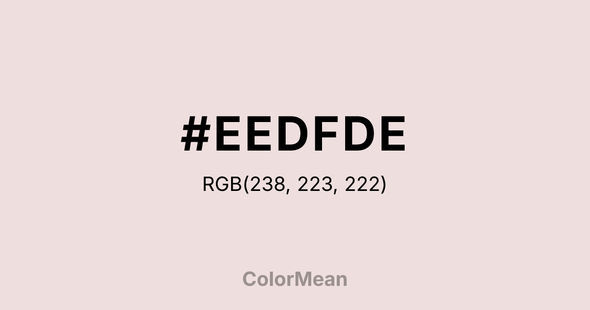 #EEDFDE RGB value is (238, 223, 222). The hex color red value is 238, green is 223, and blue is 222. Its HSL format shows a hue of 4°, saturation of 32 percent, and lightness of 90 percent. The CMYK process values are 0 percent, 6 percent, 7 percent, 7 percent.