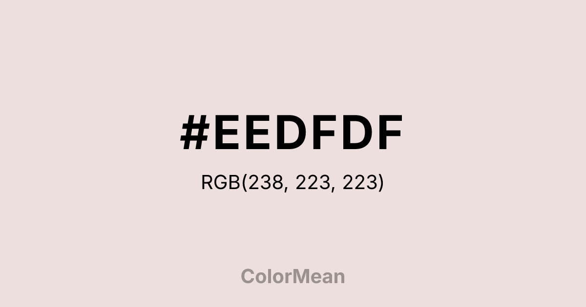 #EEDFDF RGB value is (238, 223, 223). The hex color red value is 238, green is 223, and blue is 223. Its HSL format shows a hue of 0°, saturation of 31 percent, and lightness of 90 percent. The CMYK process values are 0 percent, 6 percent, 6 percent, 7 percent.