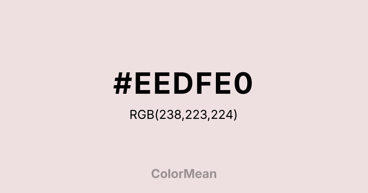 #EEDFE0 RGB value is (238, 223, 224). The hex color red value is 238, green is 223, and blue is 224. Its HSL format shows a hue of 356°, saturation of 31 percent, and lightness of 90 percent. The CMYK process values are 0 percent, 6 percent, 6 percent, 7 percent.
