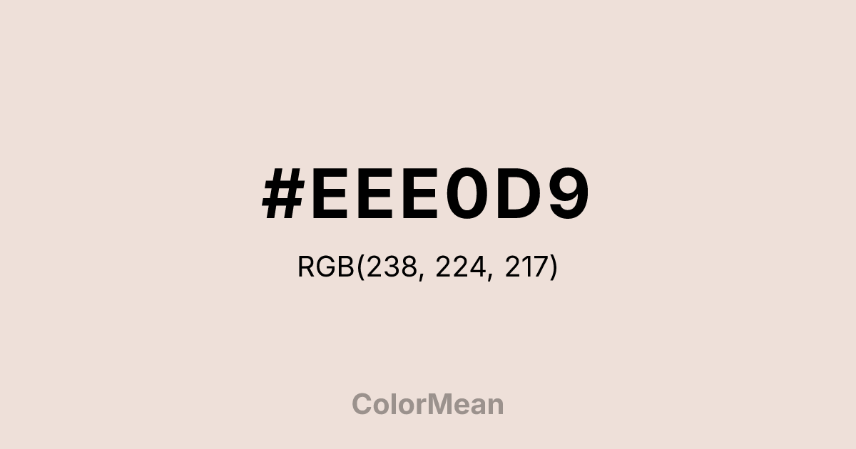 #EEE0D9 RGB value is (238, 224, 217). The hex color red value is 238, green is 224, and blue is 217. Its HSL format shows a hue of 20°, saturation of 38 percent, and lightness of 89 percent. The CMYK process values are 0 percent, 6 percent, 9 percent, 7 percent.