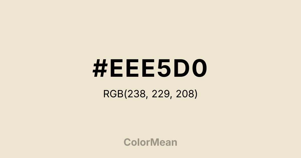 #EEE5D0 RGB value is (238, 229, 208). The hex color red value is 238, green is 229, and blue is 208. Its HSL format shows a hue of 42°, saturation of 47 percent, and lightness of 87 percent. The CMYK process values are 0 percent, 4 percent, 13 percent, 7 percent.