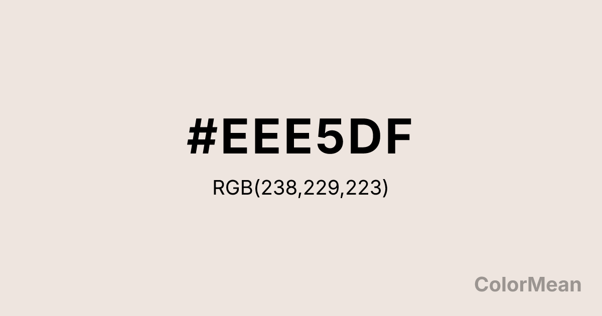 #EEE5DF RGB value is (238, 229, 223). The hex color red value is 238, green is 229, and blue is 223. Its HSL format shows a hue of 24°, saturation of 31 percent, and lightness of 90 percent. The CMYK process values are 0 percent, 4 percent, 6 percent, 7 percent.