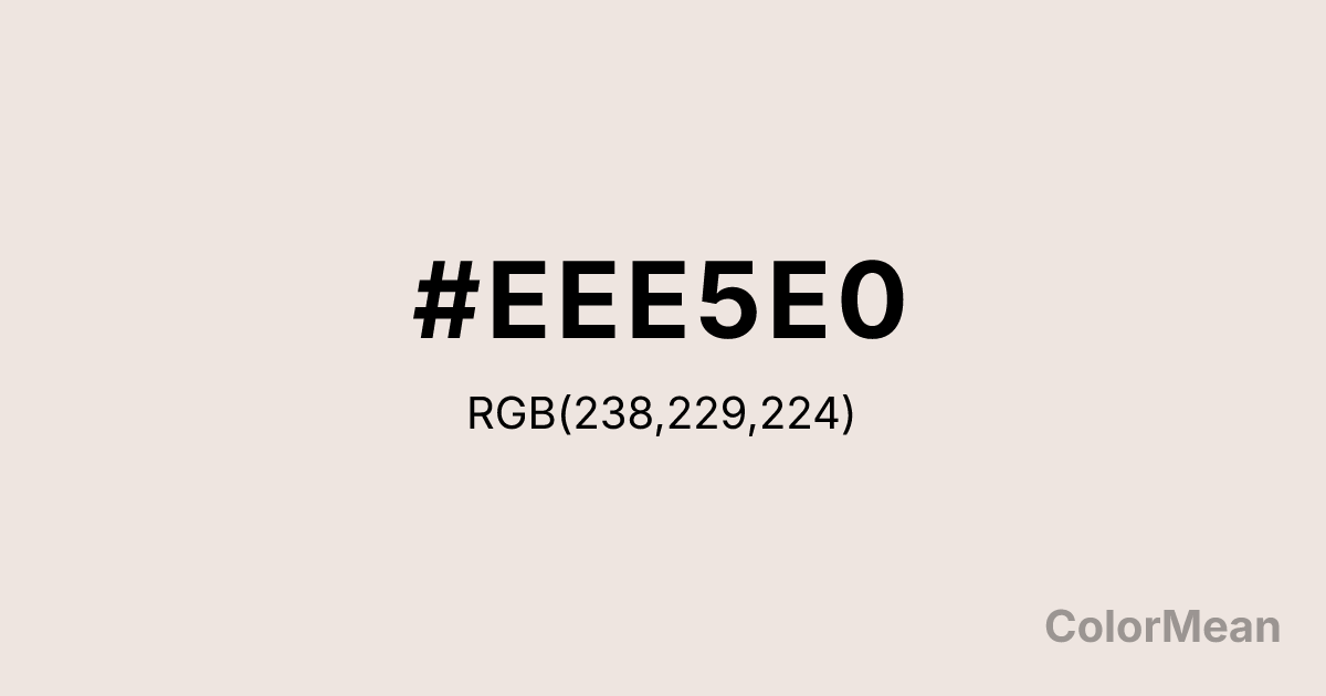 #EEE5E0 RGB value is (238, 229, 224). The hex color red value is 238, green is 229, and blue is 224. Its HSL format shows a hue of 21°, saturation of 29 percent, and lightness of 91 percent. The CMYK process values are 0 percent, 4 percent, 6 percent, 7 percent.