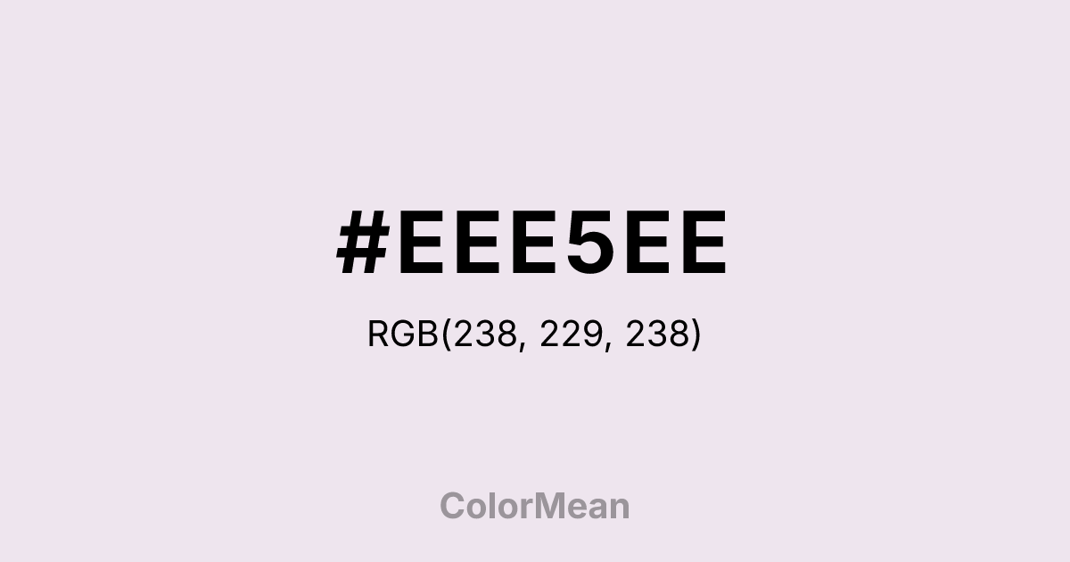 #EEE5EE RGB value is (238, 229, 238). The hex color red value is 238, green is 229, and blue is 238. Its HSL format shows a hue of 300°, saturation of 21 percent, and lightness of 92 percent. The CMYK process values are 0 percent, 4 percent, 0 percent, 7 percent.
