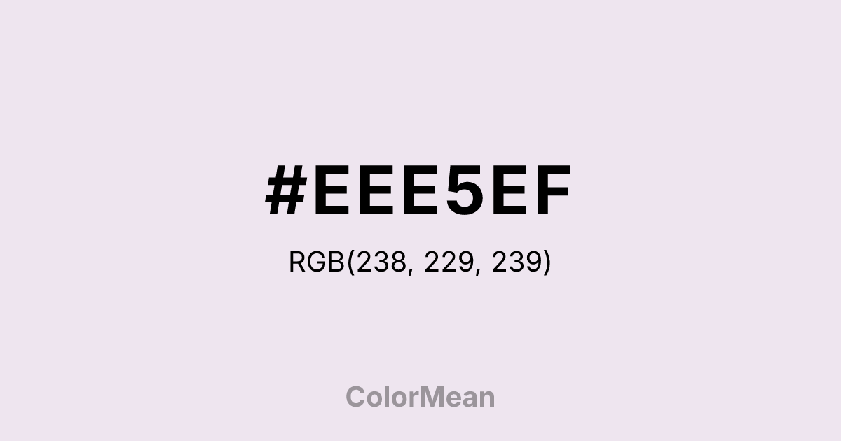 #EEE5EF RGB value is (238, 229, 239). The hex color red value is 238, green is 229, and blue is 239. Its HSL format shows a hue of 294°, saturation of 24 percent, and lightness of 92 percent. The CMYK process values are 0 percent, 4 percent, 0 percent, 6 percent.