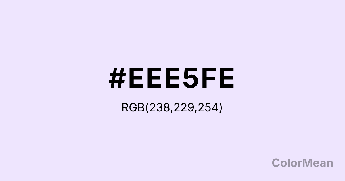 #EEE5FE RGB value is (238, 229, 254). The hex color red value is 238, green is 229, and blue is 254. Its HSL format shows a hue of 262°, saturation of 93 percent, and lightness of 95 percent. The CMYK process values are 6 percent, 10 percent, 0 percent, 0 percent.