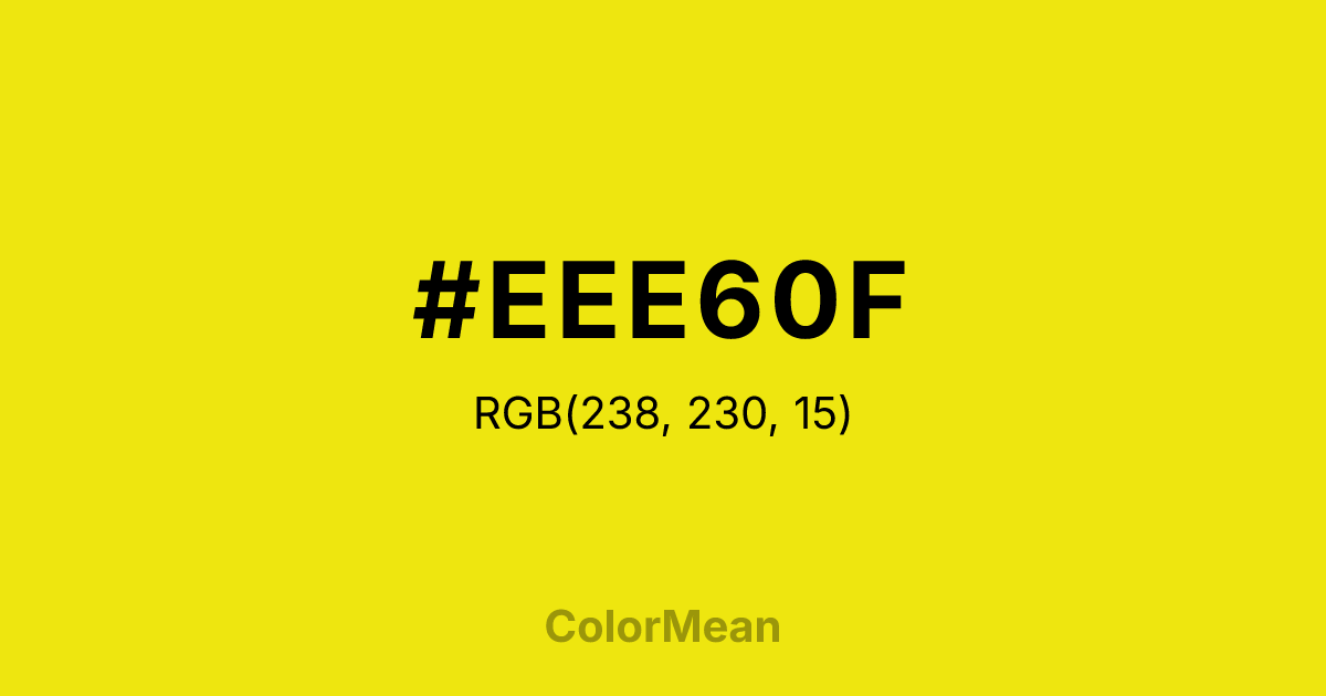 #EEE60F RGB value is (238, 230, 15). The hex color red value is 238, green is 230, and blue is 15. Its HSL format shows a hue of 58°, saturation of 88 percent, and lightness of 50 percent. The CMYK process values are 0 percent, 3 percent, 94 percent, 7 percent.