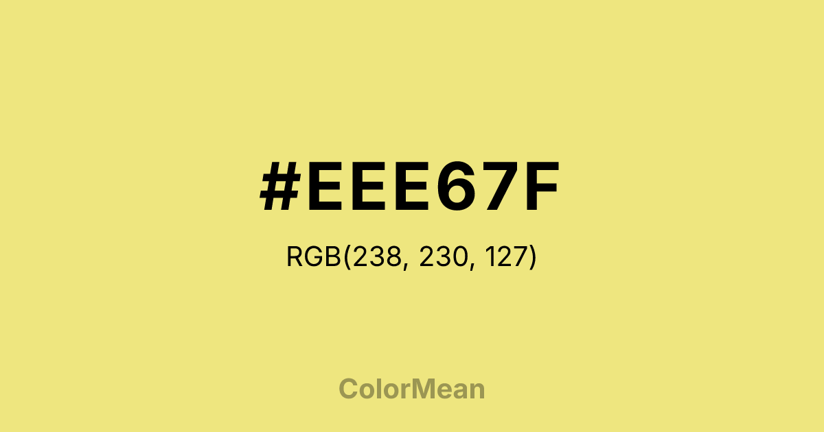 #EEE67F RGB value is (238, 230, 127). The hex color red value is 238, green is 230, and blue is 127. Its HSL format shows a hue of 56°, saturation of 77 percent, and lightness of 72 percent. The CMYK process values are 0 percent, 3 percent, 47 percent, 7 percent.